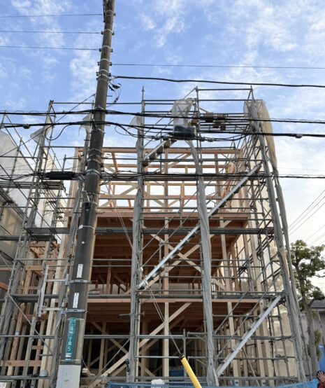 本日、朝から大工さんたちが息を合わせ、無事に上棟いたしました。